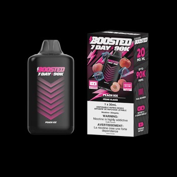 Boosted 7Day 90K Peach Ice delivers sweet peach with cooling menthol in a massive 90,000-puff disposable device.