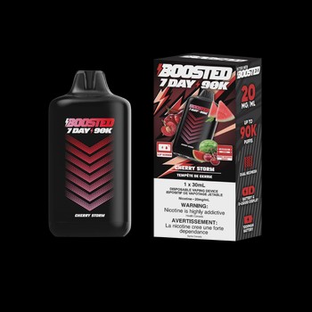Boosted 7Day 90K Cherry Storm delivers up to 90,000 puffs of layered cherry flavor with a striking watermelon finish.