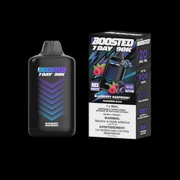 Boosted 7Day 90K Blueberry Raspberry delivers up to 90,000 puffs of bold berry flavor with dual mesh coil technology.