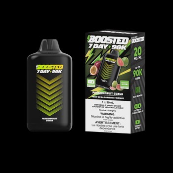 Boosted 7Day 90K Passionfruit Guava delivers up to 90,000 puffs of tropical flavor with dual mesh coil technology and LED screen display.