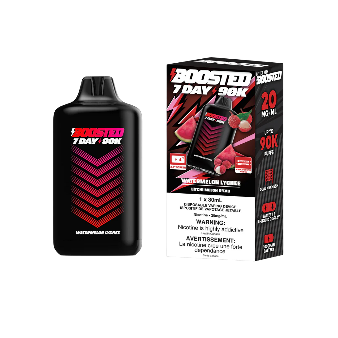 Boosted 7Day 90K Watermelon Lychee delivers 90,000 puffs of tropical watermelon and exotic lychee flavor that lasts for weeks of reliable vaping.
