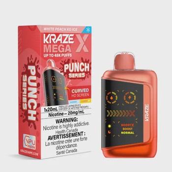 KRAZE Mega X Punch Series White Peach KO Ice delivers 48,000 puffs of smooth white peach with refreshing menthol for weeks of consistent flavor.