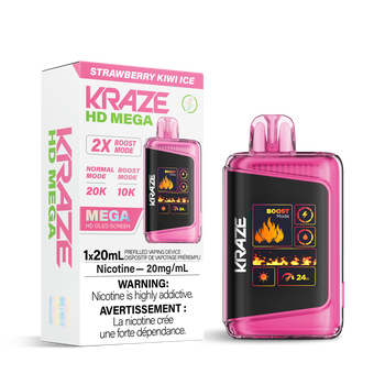 Kraze HD Mega - Strawberry Kiwi Ice delivers 20,000 puffs of sweet strawberry-kiwi with icy coolness and dual power modes.