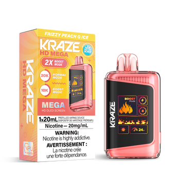 Kraze HD Mega Frizzy Peach G Ice delivers 20,000 puffs of fizzy peach soda flavor with refreshing menthol and dual mesh coils for ultimate taste.