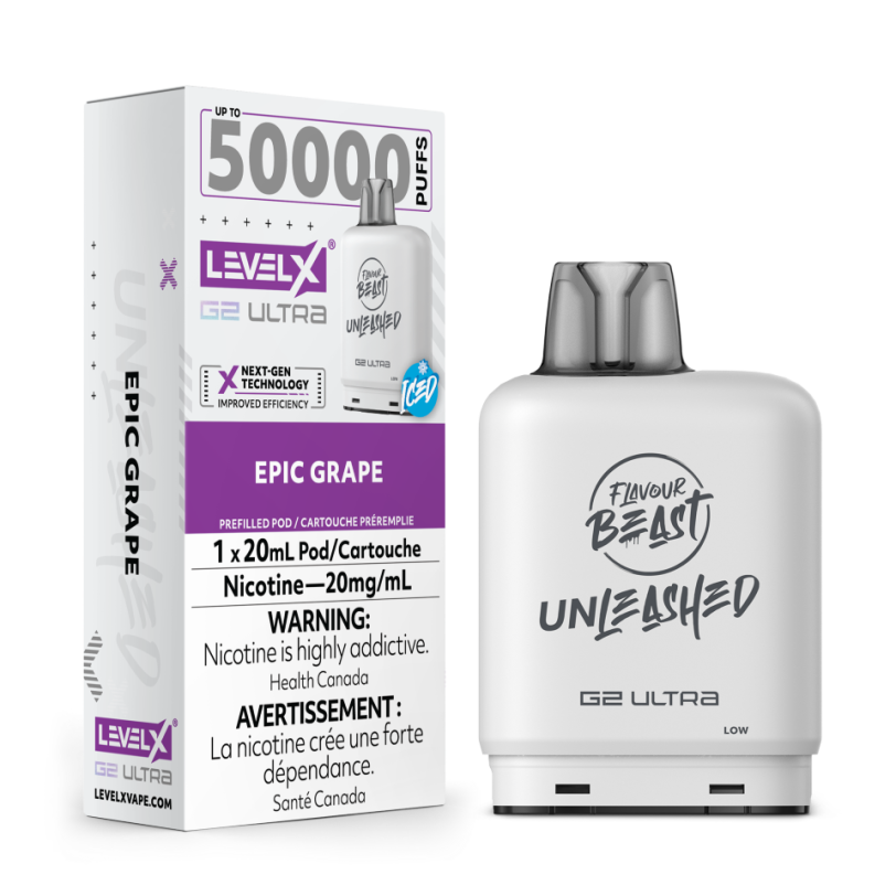 Level X Flavour Beast Unleashed G2 Ultra 50k Epic Grape Iced delivers 50,000 puffs of juicy grape flavor with refreshing menthol cooling.