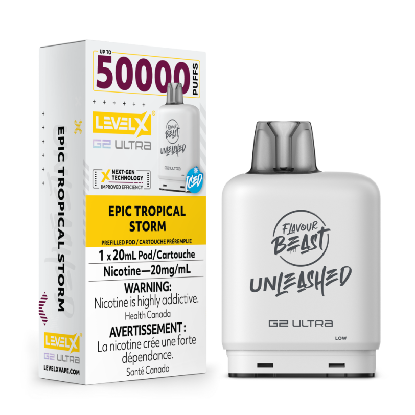 Level X Flavour Beast Unleashed G2 Ultra 50k Epic Tropical Storm Iced delivers 50,000 puffs of tropical fruits with cooling menthol finish.