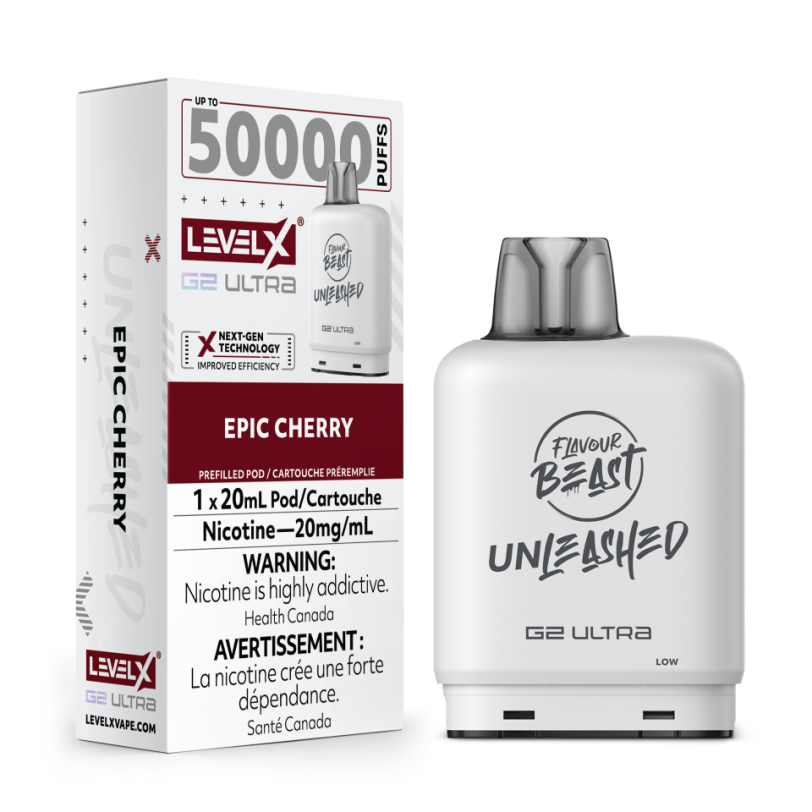 Level X Flavour Beast G2 Ultra 50k Epic Cherry delivers 50,000 puffs of bold, sweet cherry flavor in a convenient pod system format.
