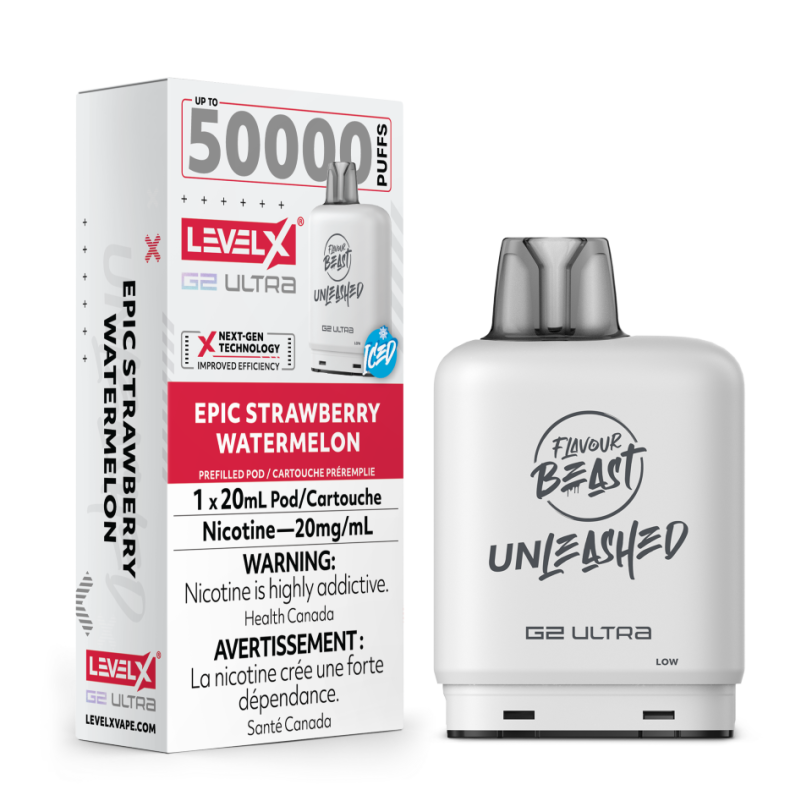 Level X Flavour Beast Unleashed G2 Ultra 50k Epic Strawberry Watermelon Iced delivers 50,000 puffs of cool fruit bliss in one convenient pod.