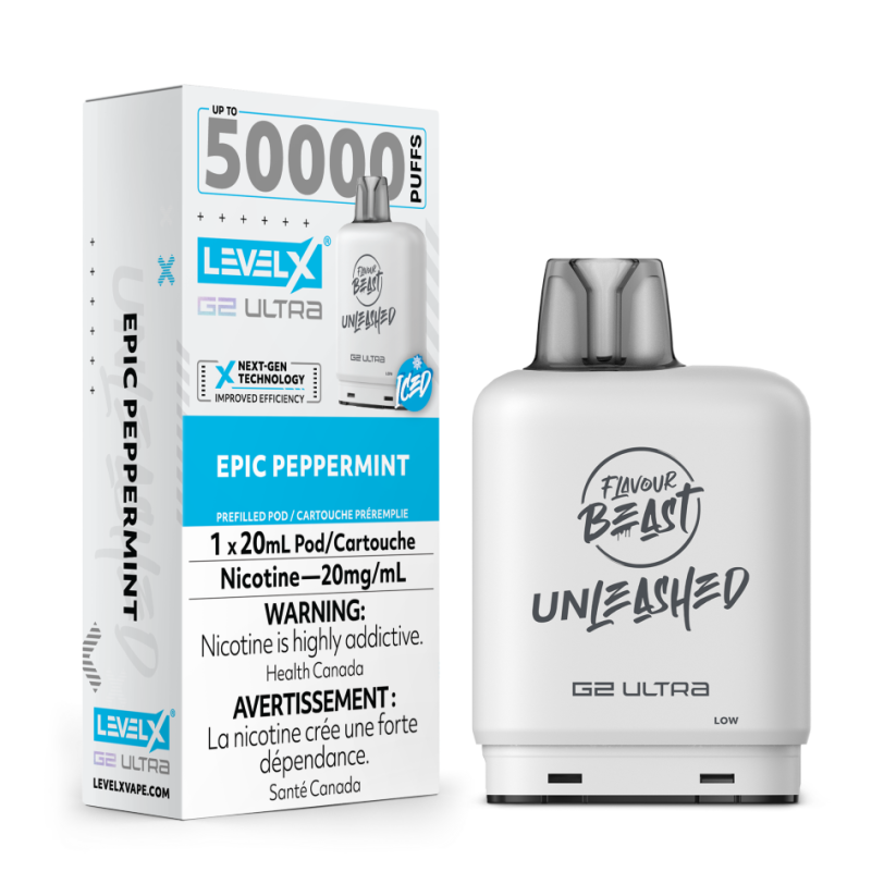 Level X Flavour Beast Unleashed G2 Ultra 50k Epic Peppermint Iced delivers 50,000 puffs of bold mint with intense cooling action.