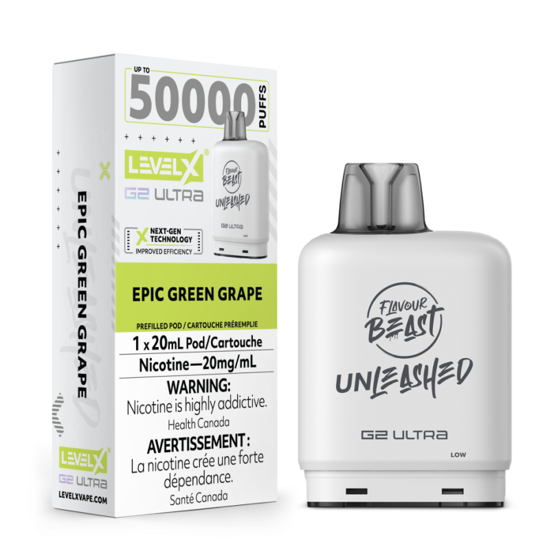 Level X Flavour Beast Unleashed G2 Ultra 50k Epic Green Grape delivers 50,000 puffs of bold, juicy green grape flavor for maximum value.