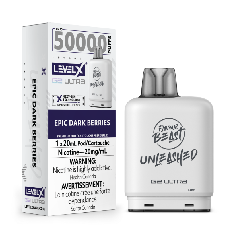 Level X Flavour Beast Unleashed G2 Ultra 50k Epic Dark Berries delivers 50,000 puffs of rich blackberry and blueberry flavors in a reliable pod system.