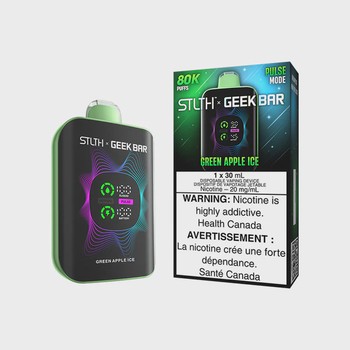 STLTH X GEEK BAR 80K Green Apple Ice delivers 80,000 puffs of crisp apple with cooling menthol and dual mesh coils for consistent flavor.