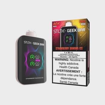 STLTH X GEEK BAR 80K Strawberry Banana Ice delivers 80,000 puffs of smooth strawberry banana with cooling menthol in one rechargeable device.