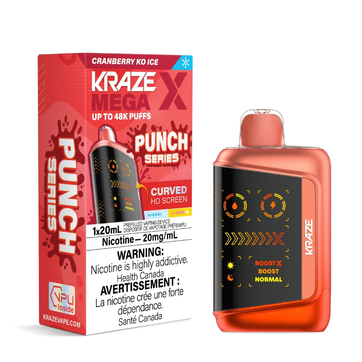 KRAZE Mega X Punch Series Cranberry KO Ice delivers 48,000 puffs of intense tangy cranberry with cooling menthol for extended vaping sessions.
