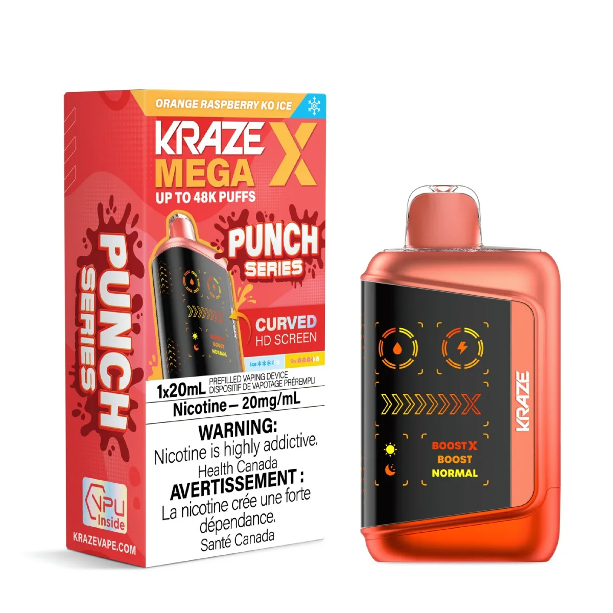 KRAZE Mega X Punch Series Orange Raspberry KO Ice delivers 48,000 puffs of bold fruit punch flavor with an icy menthol finish in one device.