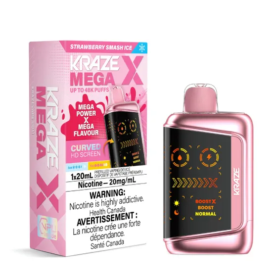 KRAZE Mega X Strawberry Smash Ice delivers 48,000 puffs of bold strawberry flavor with refreshing menthol in a premium rechargeable disposable.