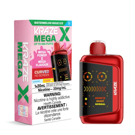 KRAZE Mega X Watermelon Wave Ice delivers 48,000 puffs of refreshing watermelon with icy menthol and convenient LED display monitoring.